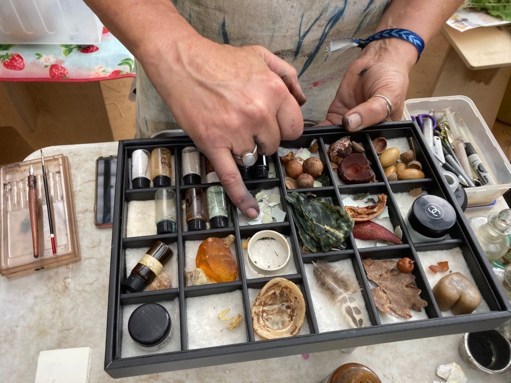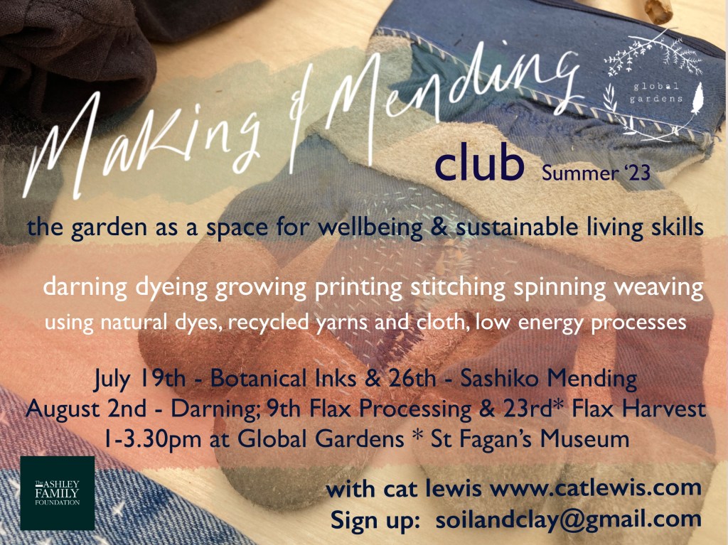 The summer season of making n mending gatherings at Global Gardens project allotment has started again, thanks to funding from the Ashley Family Foundation grant. We’ve started making a dye reference resource, dyeing scraps with garden plants and dye powders, to be kept in the classroom.