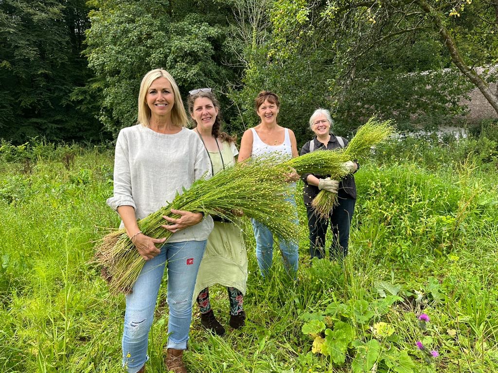 3/4 of the dry crop was then retted in a galvanised tank at Global Gardens. It was late to do it but as it was an unusually warm October week I went for it! Two weeks later and 10 degrees colder, i decided to take it out. It was left on the floor inside for three days, and then tested – it is perfect and it’s the same light gold green colour as our first crop 3 years ago that was also retted in the tank.