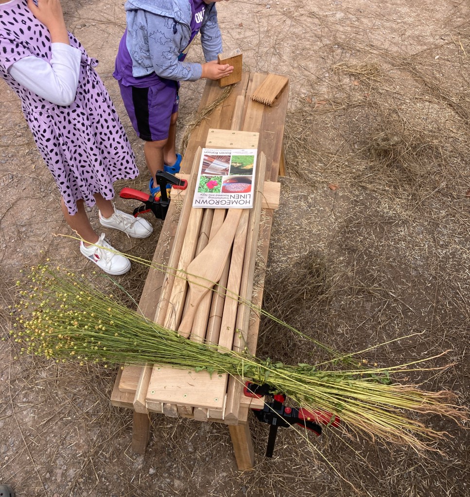 The crop was hung under cover at St Fagan’s farm to dry. Then rippled in the farmyard with help from visitors, who were all fascinated. We were able to have a first go with our beautiful breaker, made by Dylan in Machynlleth, from fallen beech. It’s a hefty beast!