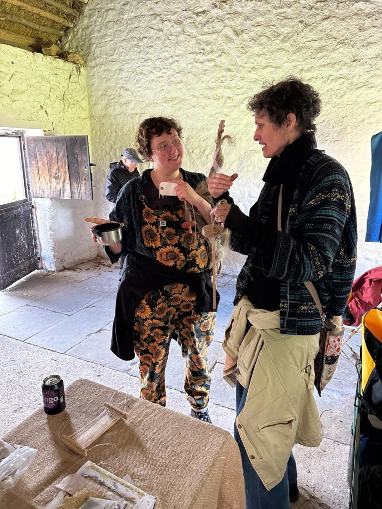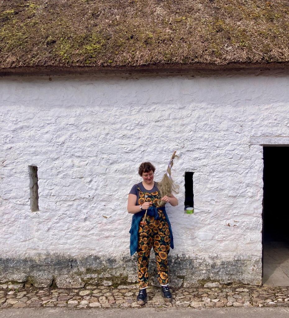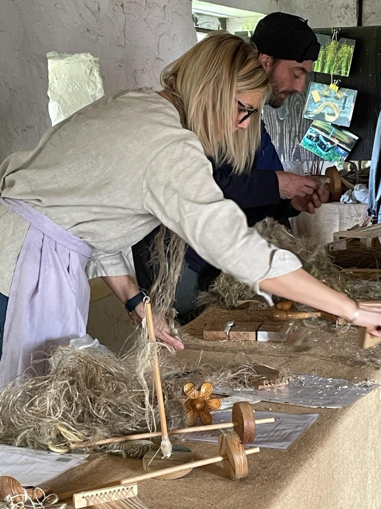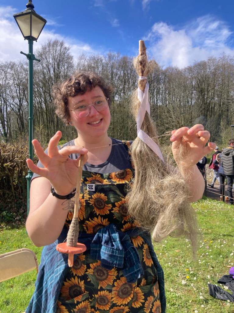 We had a group spinning out in the spring sunshine, little kids learning to make cordage, bigger ones going for it breaking the retted flax with the Beast of Machynlleth, and had lovely chats with so many intrigued, astounded and super interested people from so many places around the world. We had our woodcrafters from #Goodshed community project visit, to see their new little all in one hand tools in use. They’re made with scrap wood and we’re playing with the shape to make them easier for smaller hands. They’re also making drop spindles and hopefully we’ll soon have some hackles!