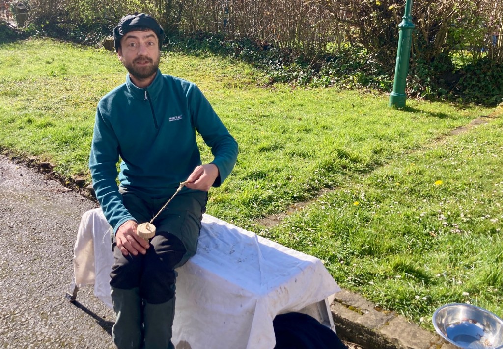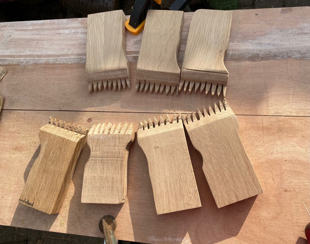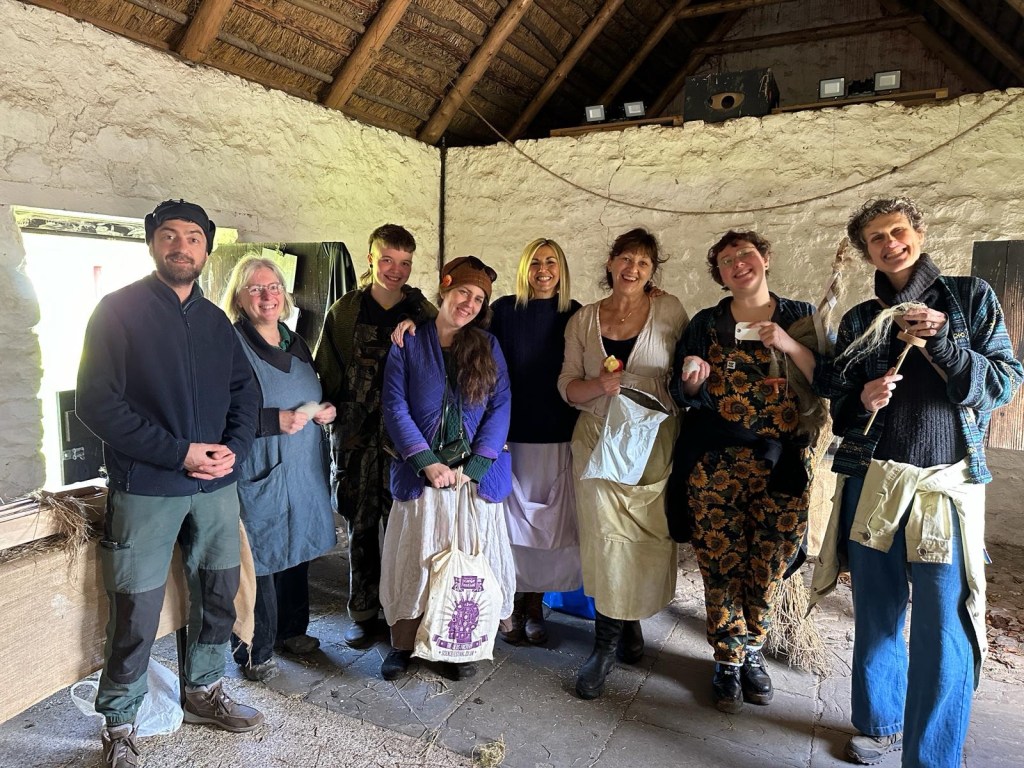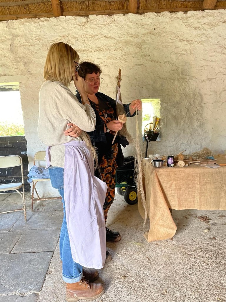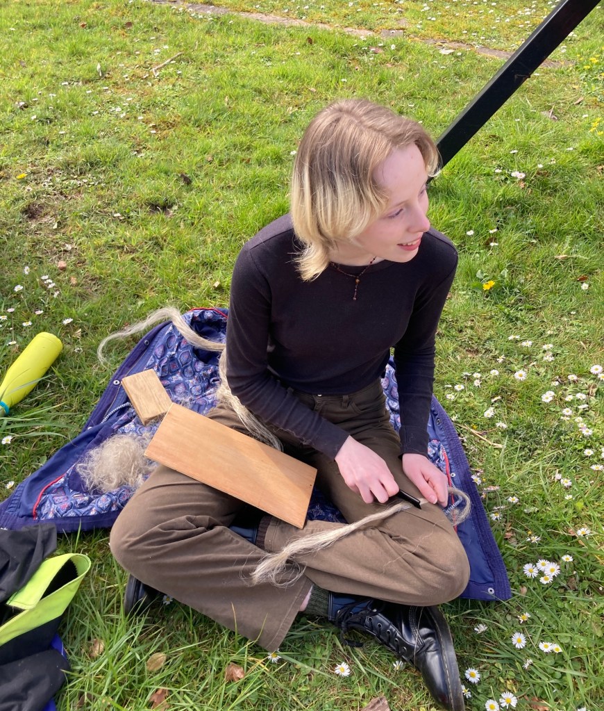 We had a group spinning out in the spring sunshine, little kids learning to make cordage, bigger ones going for it breaking the retted flax with the Beast of Machynlleth, and had lovely chats with so many intrigued, astounded and super interested people from so many places around the world. We had our woodcrafters from #Goodshed community project visit, to see their new little all in one hand tools in use. They’re made with scrap wood and we’re playing with the shape to make them easier for smaller hands. They’re also making drop spindles and hopefully we’ll soon have some hackles!