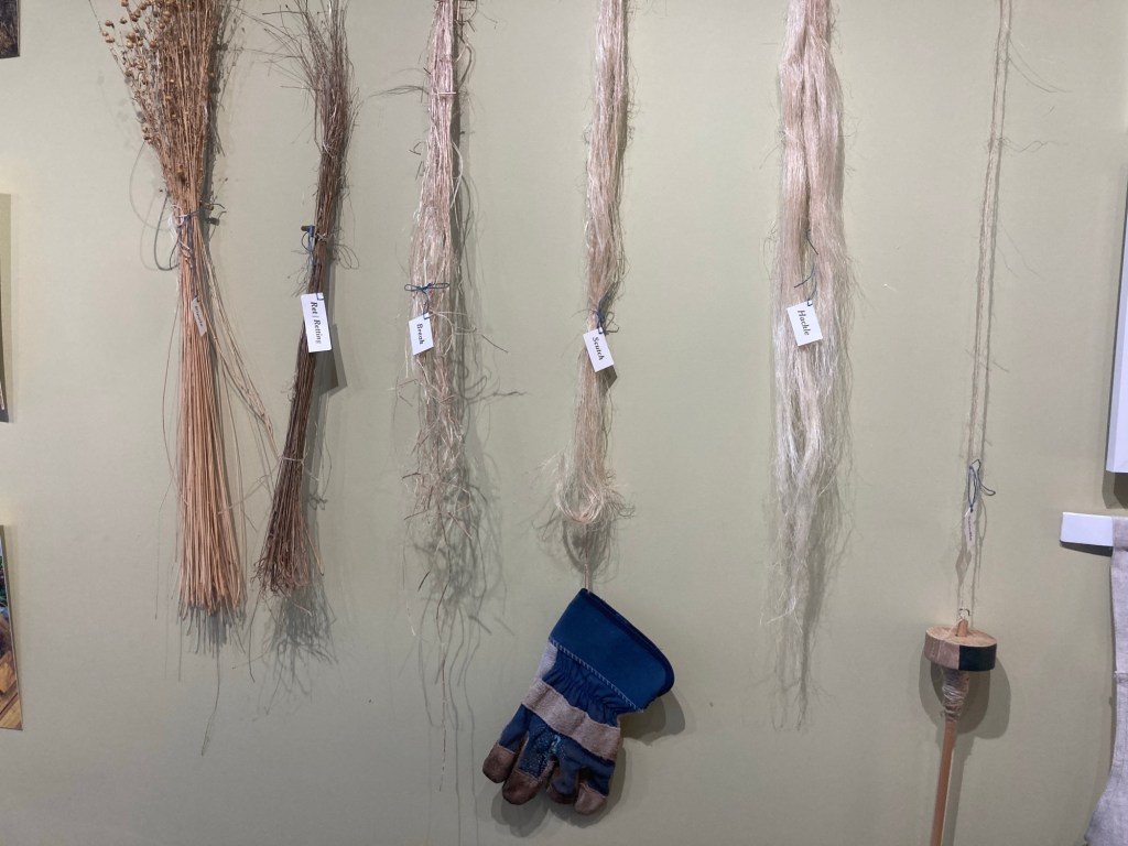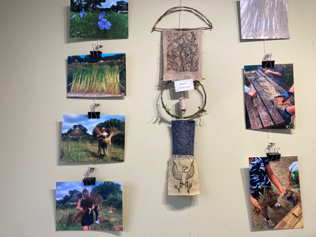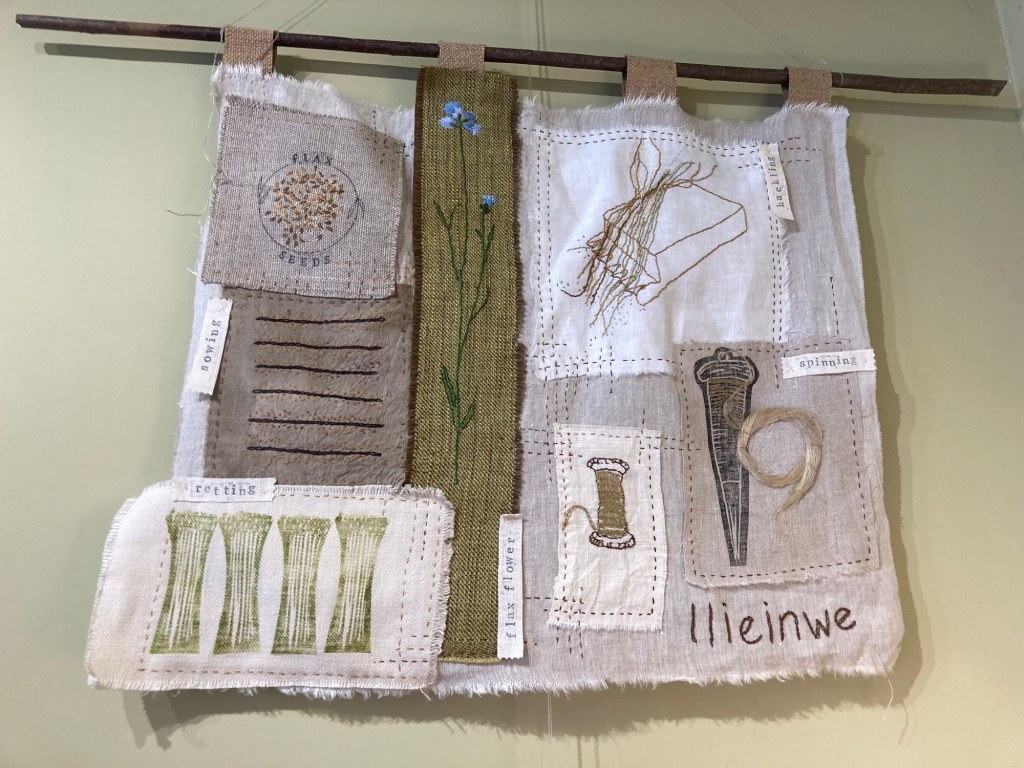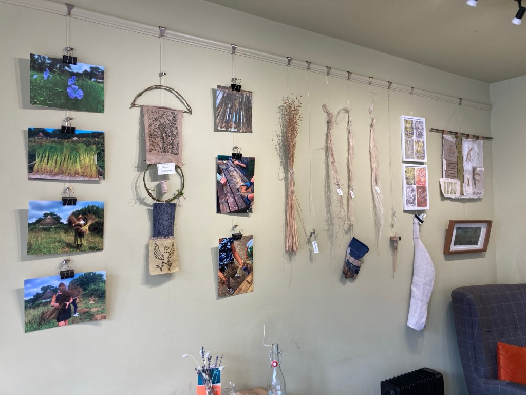 We were offered the space in this lovely little local tea shop (also good coffee, lovely food and nice people). We have tried to show the people and the skills involved in the process of growing and transforming flax to make linen yarn. There’s photos of the team, samples of the flax in all its stages, the tools, the yarn and artworks including stitch, dye and print.