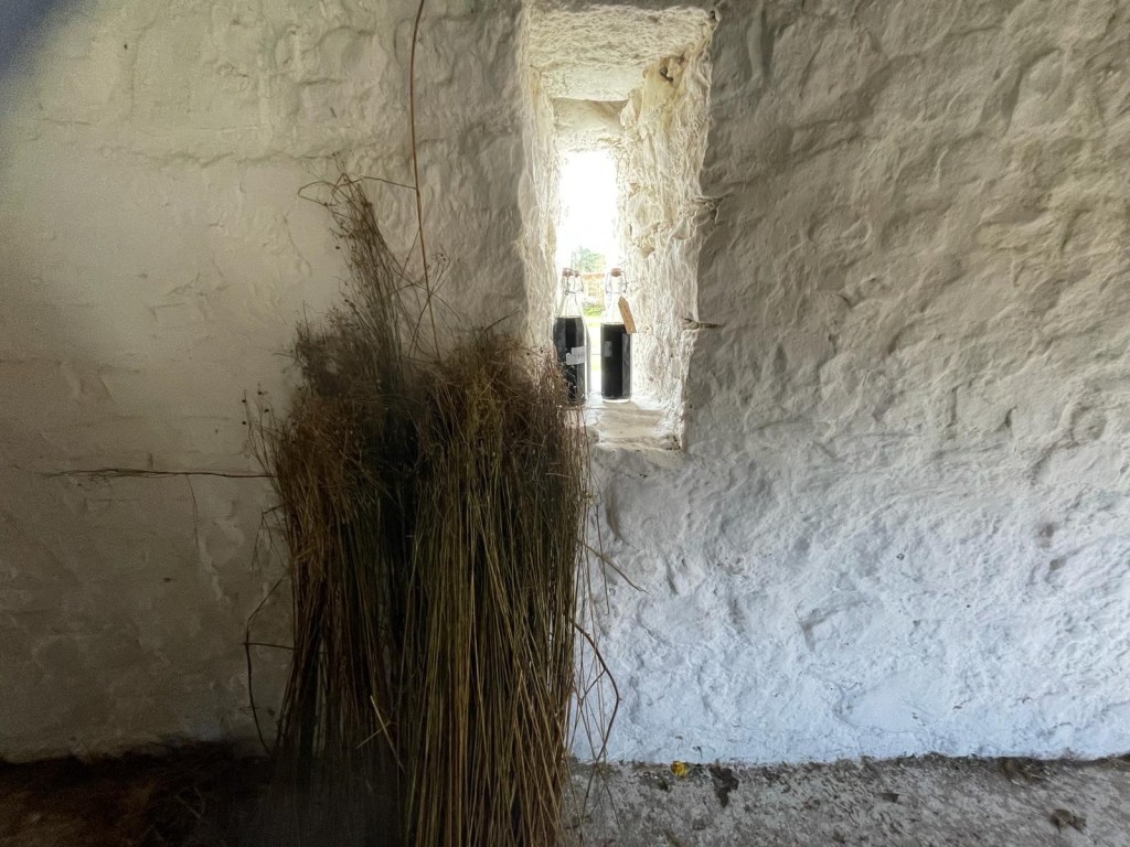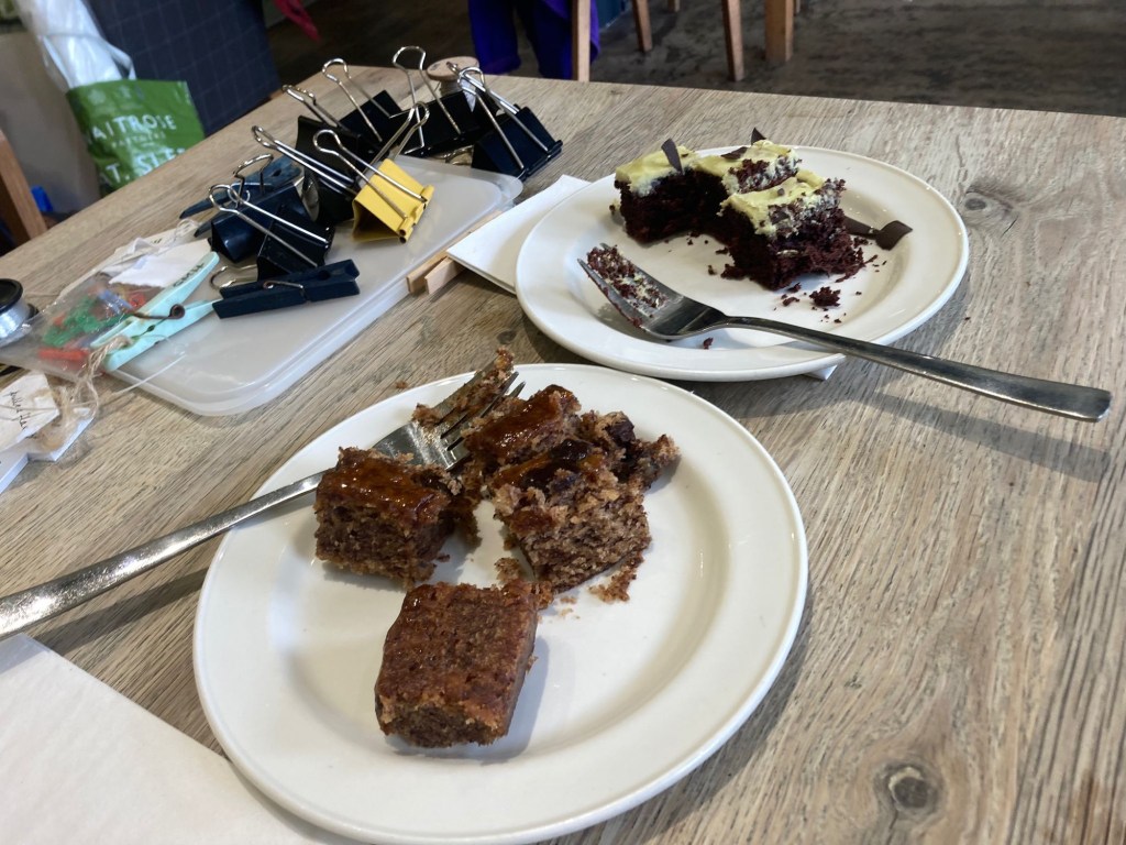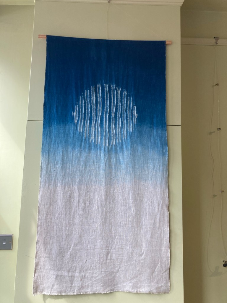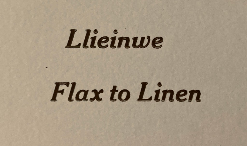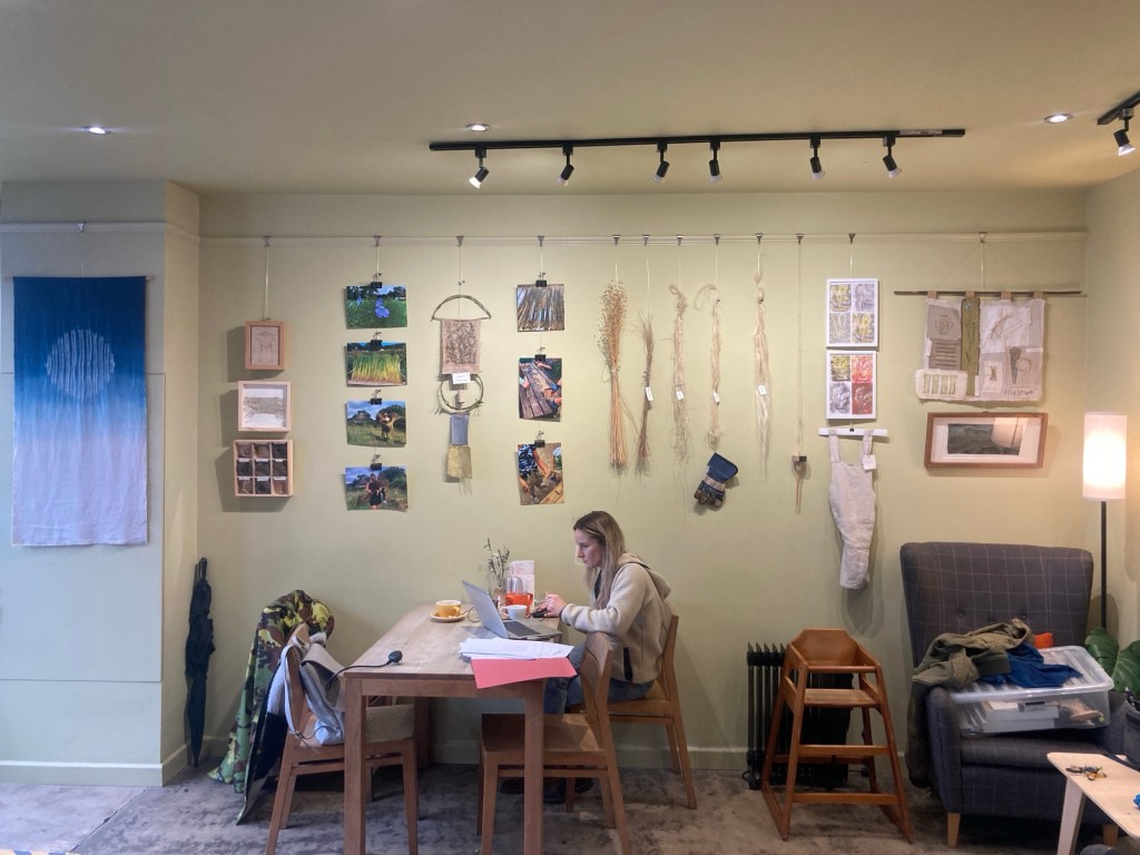 We were offered the space in this lovely little local tea shop (also good coffee, lovely food and nice people). We have tried to show the people and the skills involved in the process of growing and transforming flax to make linen yarn. There’s photos of the team, samples of the flax in all its stages, the tools, the yarn and artworks including stitch, dye and print.