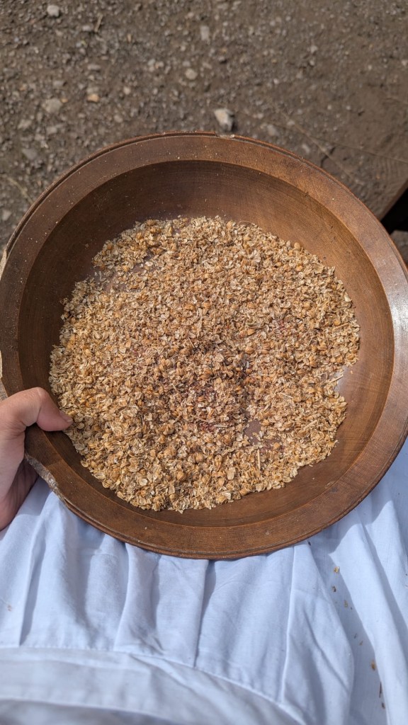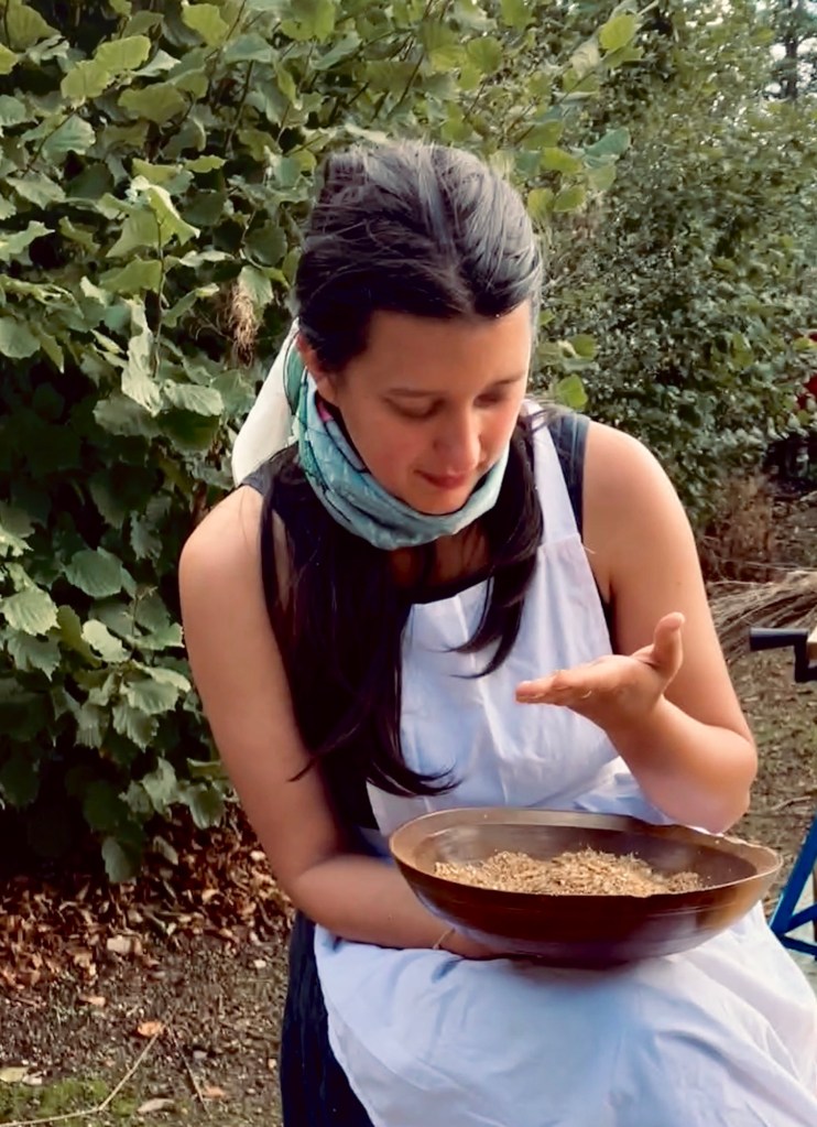 Then we rippled and winnowed the seed on a blowy September, in the yard of the farmhouse where it was grown.