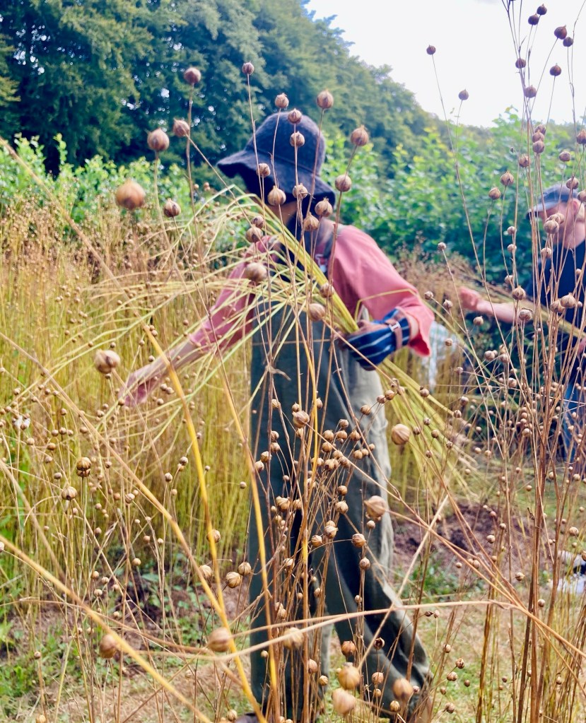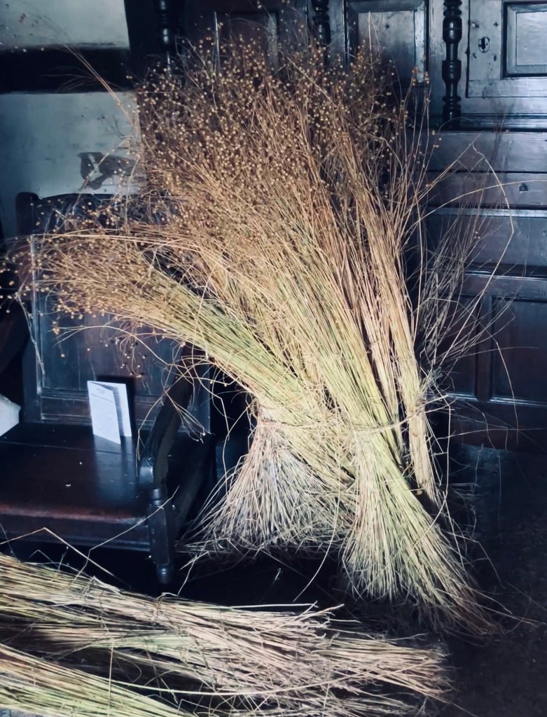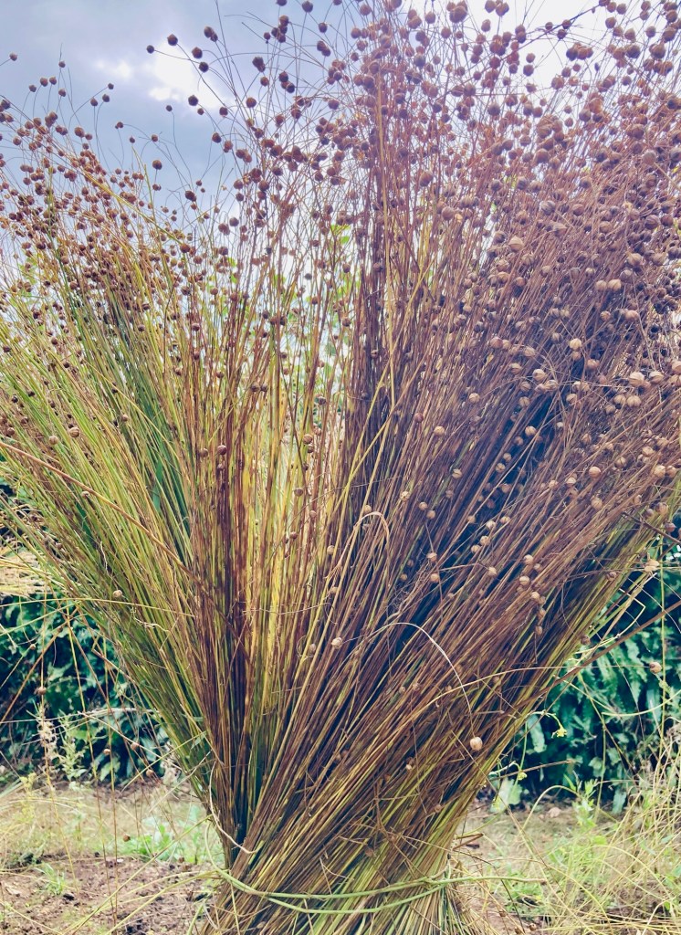 The flax planted at Abernodwydd garden was pulled up over three sessions during August, then stored in the barn in bundled stooks, allowing it to dry and the seed bolls to develop.